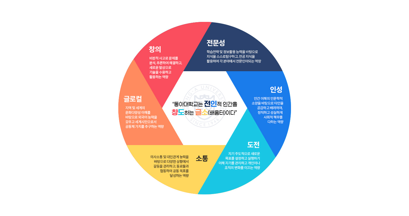 동아대 6대 핵심역량은 인성을 바탕으로 전문성과 소통을 통하여 창의적이고 도전적 사고로 변화를 주도하며 지역을 넘어 세계를 품는 세계시민으로서의 동좌문도의 교육이념을 실현함